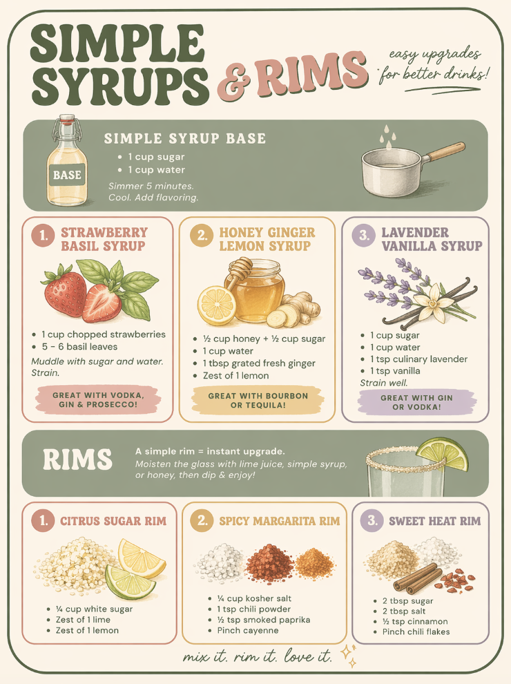 If your drinks are feeling a little… underwhelming, this is for you. We’re talking simple syrups, fun rims, and easy ways to make your cocktails and mocktails feel like you actually tried (even if you didn’t). It’s quick, it’s simple, and it makes a $3 drink taste like a $14 one.